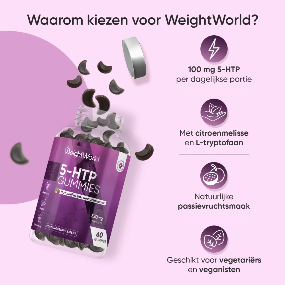 5-HTP Gummies van WeightWorld zijn zorgvuldig geformuleerd. Elke dagelijkse portie van 2 gummies bevat in totaal 330 mg aan actieve ingrediënten, waaronder 100 mg 5-HTP, 110 mg L-tryptofaan en 120 mg citroenmelisse-extract. De gummies hebben een natuurlijke passievruchtensmaak en zijn volledig vegan, glutenvrij en GMO-vrij. Bovendien worden ze geproduceerd volgens de hoge GMP-kwaliteitsstandaarden voor voedingssupplementen. Met 60 gummies per verpakking heb je een voorraad voor een volledige maand.