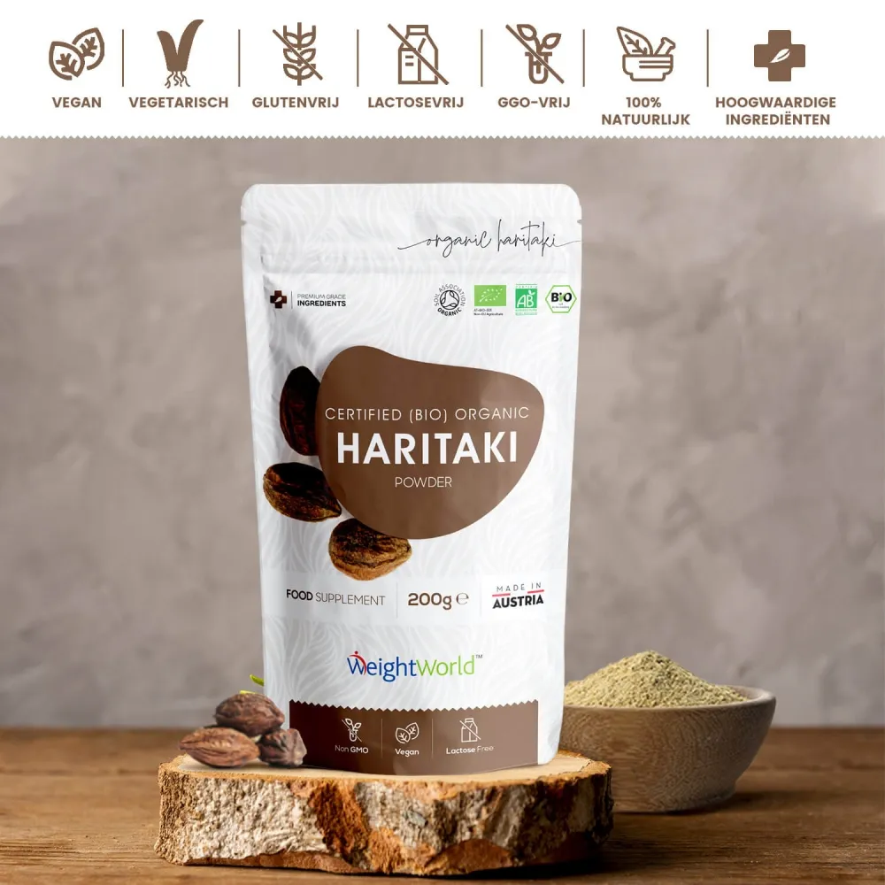 Haritaki is een exotische Zuid-Aziatische struik die wordt gevonden in de Himalaya. Haritaki is al honderden jaren populair en wordt wereldwijd gebruikt voor verschillende doeleinden. WeightWorld heeft een gecertificeerd biologisch Ayurveda supplement ontwikkeld met puur en hoogwaardig Haritaki fruit uit de Himalaya. Bio Haritaki poeder bestaat uit 100% biologisch Haritaki fruit en is gemaakt zonder toevoegingen en schadelijke ingrediënten. De Haritaki vruchten zijn afkomstig van biologische en gecontroleerde teelt en zijn vervolgens volgens hoogwaardige processen gedroogd, verwerkt en vermalen tot fijn poeder.