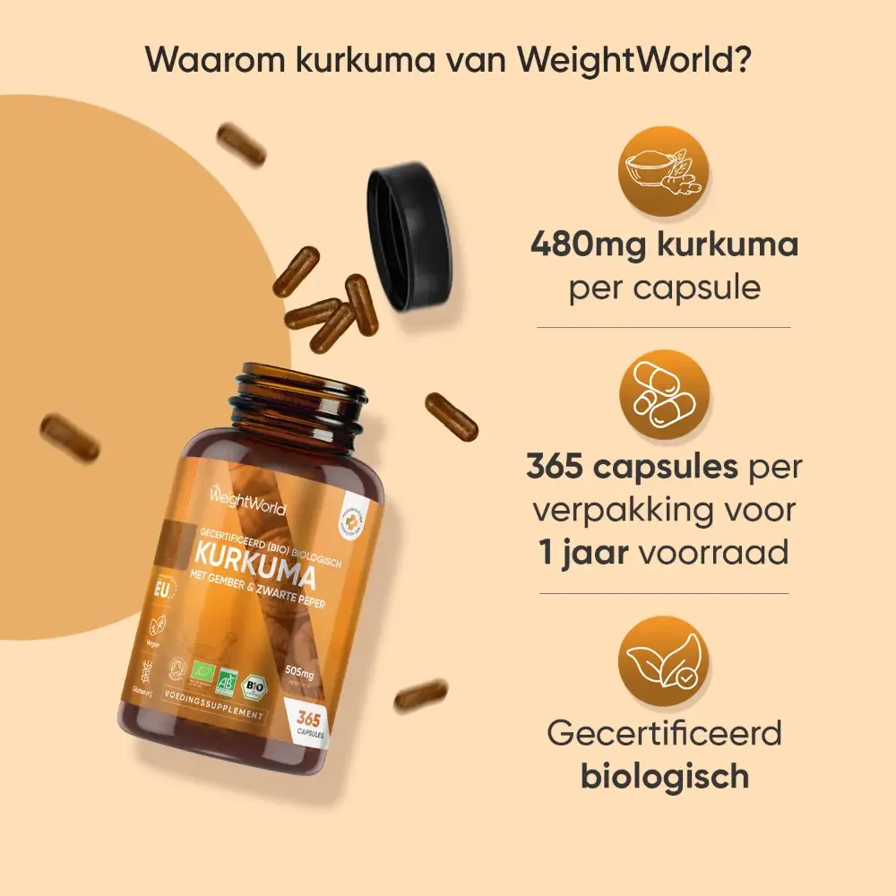 Het kurkuma complex van WeightWorld bevat een krachtige combinatie van biologisch gecertificeerde ingrediënten: kurkuma, gember en zwarte peper. Elke capsule bevat 480mg biologische kurkuma, verrijkt met 20mg gember en 5mg zwarte peper. De verpakking bevat 365 vegan capsules en biedt een voorraad van 1 jaar met een dosering van slechts één capsule per dag. Het supplement is 100% plantaardig, vrij van gluten, GMO’s en magnesiumstearaat, en wordt geproduceerd volgens strikte GMP-richtlijnen binnen de EU.