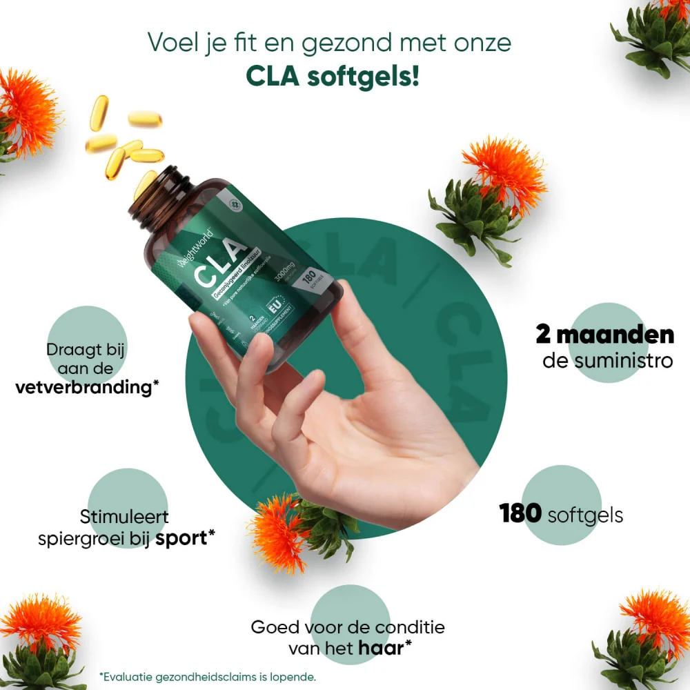 WeightWorld CLA softgels bevatten 3750 mg pure saffloerolie, wat bijdraagt aan de vetverbranding, de spiergroei stimuleert bij sporten, en goed is voor de conditie van het haar*.