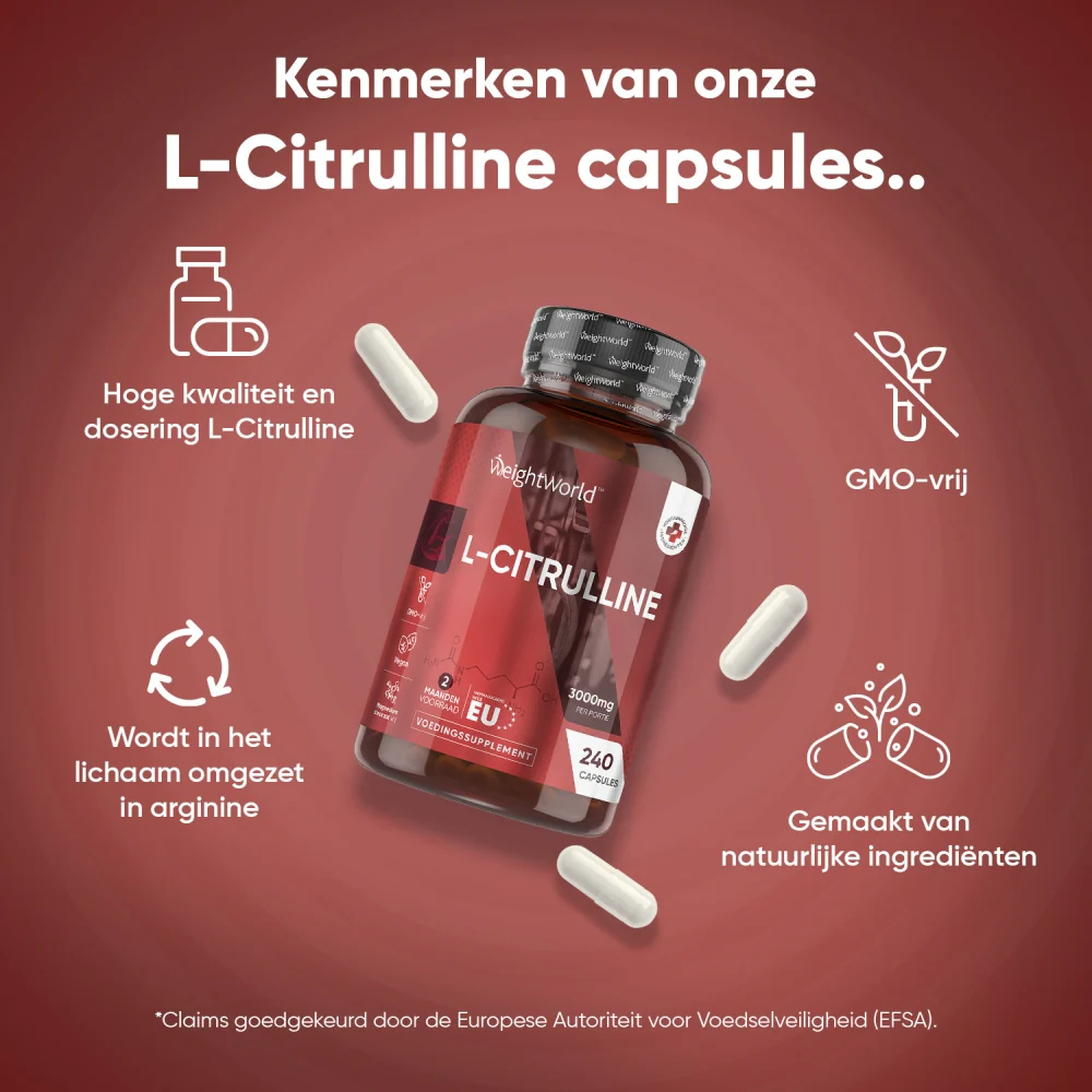 L-citrulline is een natuurlijk voorkomend aminozuur dat wordt aangetroffen in bepaalde voedingsmiddelen. Het wordt ook door het lichaam zelf geproduceerd. L-citrulline wordt in het lichaam omgezet in een ander aminozuur, L-arginine. Aminozuren zijn organische verbindingen die de bouwstenen vormen van eiwitten. Eiwitten dragen bij tot de groei van spiermassa en ondersteunen snel herstel van de spieren na training.