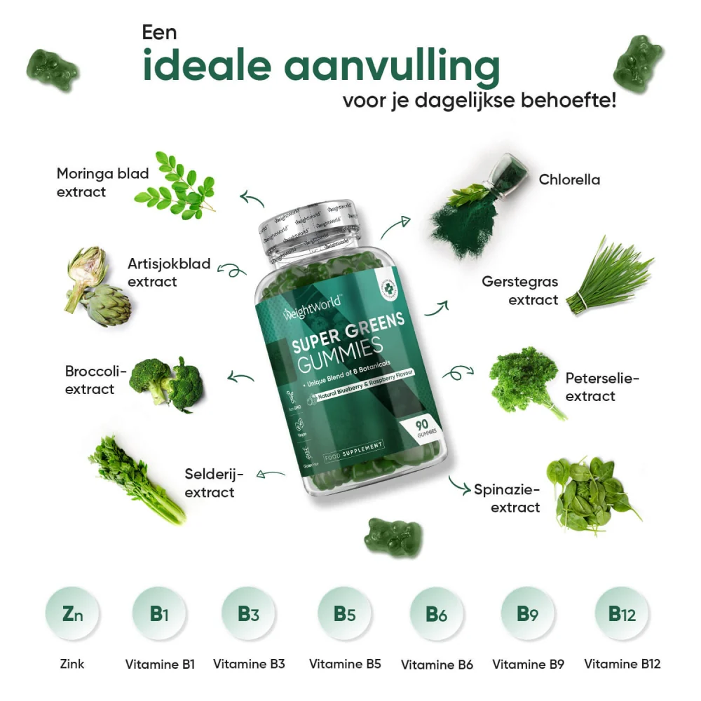 Zoetstoffen: glucosestroop, suiker, dextrose, glycerine, super greens mix (artisjokbladextract, moringabladextract, broccoli-extract, gerstegrasextract, chlorella, peterselie-extract, spinazie-extract, selderij-extract), verdikkingsmiddel: pectine, zuurteregelaars: citroenzuur en natriumcitraat, smaakstoffen: natuurlijke bosbessensmaak en natuurlijke frambozensmaak, glansmiddelen: plantaardige (palm)olie en carnaubawas, kleurstof: spinaziepoeder, zink (als zinkcitraat), vitamine B12 (als cyanocobalamine), vitamine B3 (als nicotinamide), vitamine B5 (als D-calciumpantothenaat), vitamine B6 (als pyridoxinehydrochloride), vitamine B1 (als thiaminehydrochloride), vitamine B9 (als foliumzuur).