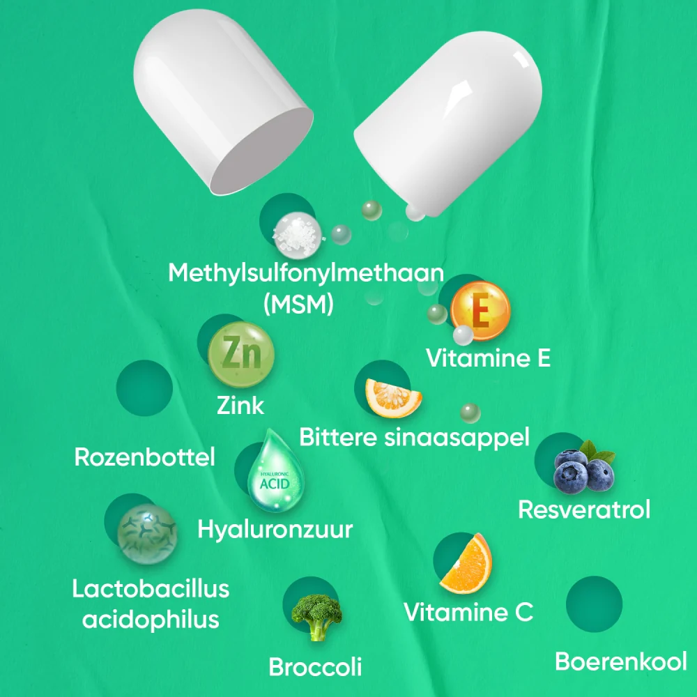 Methyl Sulfonyl Methaan, Protease, Vitamine C (als Calcium Ascorbaat en Acerola Kers), Bittere Sinaasappel (Citrus Aurantium) Poeder, Boerenkool (Brassica Oleracea var. Sabellica) Poeder, Broccoli (Brassica Oleracea var. Italica) Poeder, Rozenbottel (Rosa Canina) Poeder, Ruteine, Vitamine E (als DL-a-Tocoferol), Resveratrol (Bron: Duizendknoopzaad), Hyaluronzuur, Zink (als Zinkgluconaat), Lactobacillus Acidophilus Poeder, Antiklontermiddelen: Siliciumdioxide, Vulstof: Microkristallijne cellulose, plantaardige capsulehuls: hypromellose (HPMC).